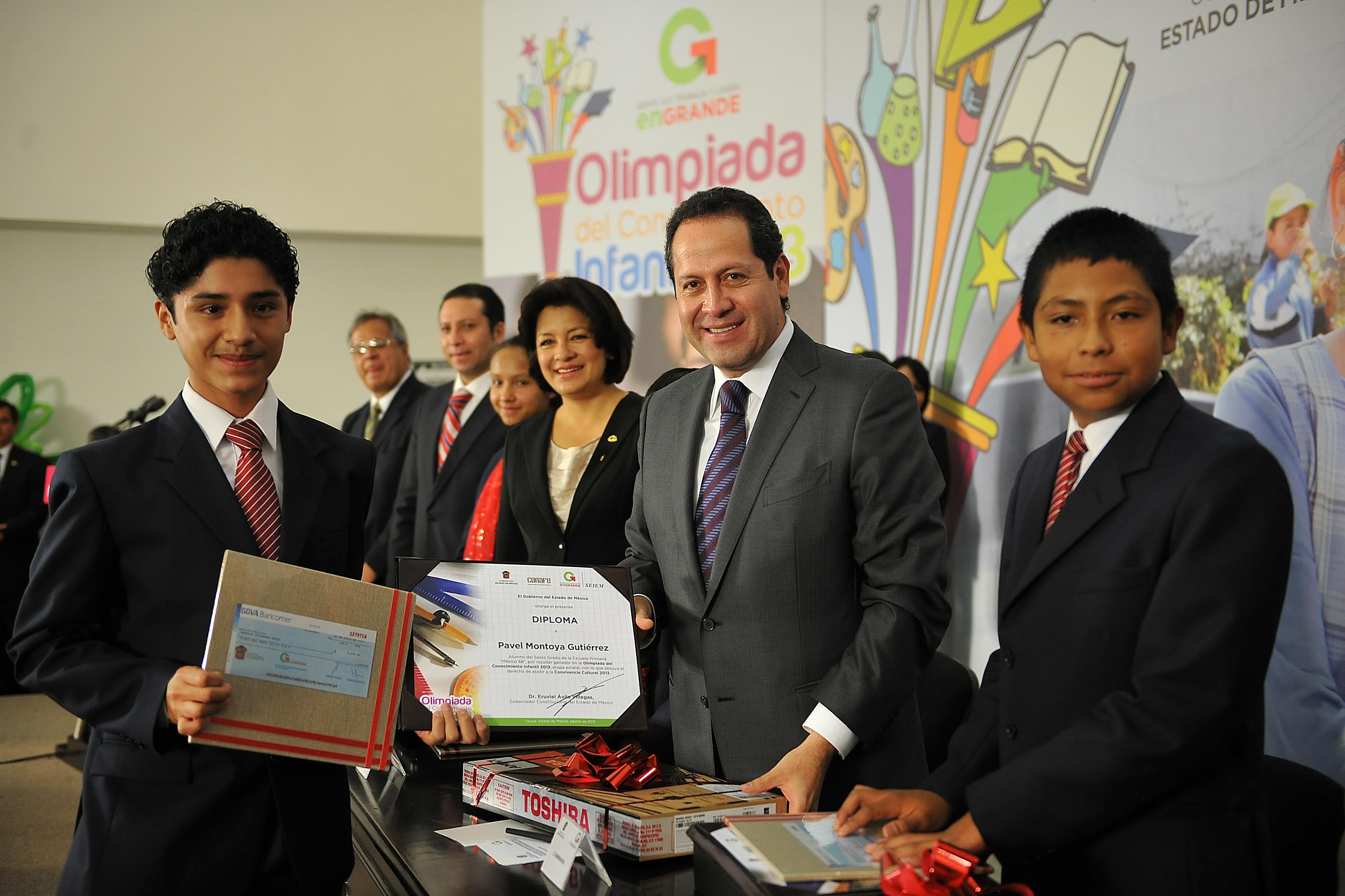 El gobernador Eruviel Ávila Villegas entregó estímulos económicos, una computadora laptop y diplomas a los 72 alumnos de sexto de primaria ganadores de la Olimpiada del Conocimiento Infantil 2013, donde dio a conocer que promoverá, mediante una iniciativa que enviará al Congreso local, que estos estudiantes reciban una beca permanente hasta que concluyan sus estudios profesionales, con el propósito de que cuenten con un apoyo integral durante su preparación académica, y tener mexiquenses mejor preparados.