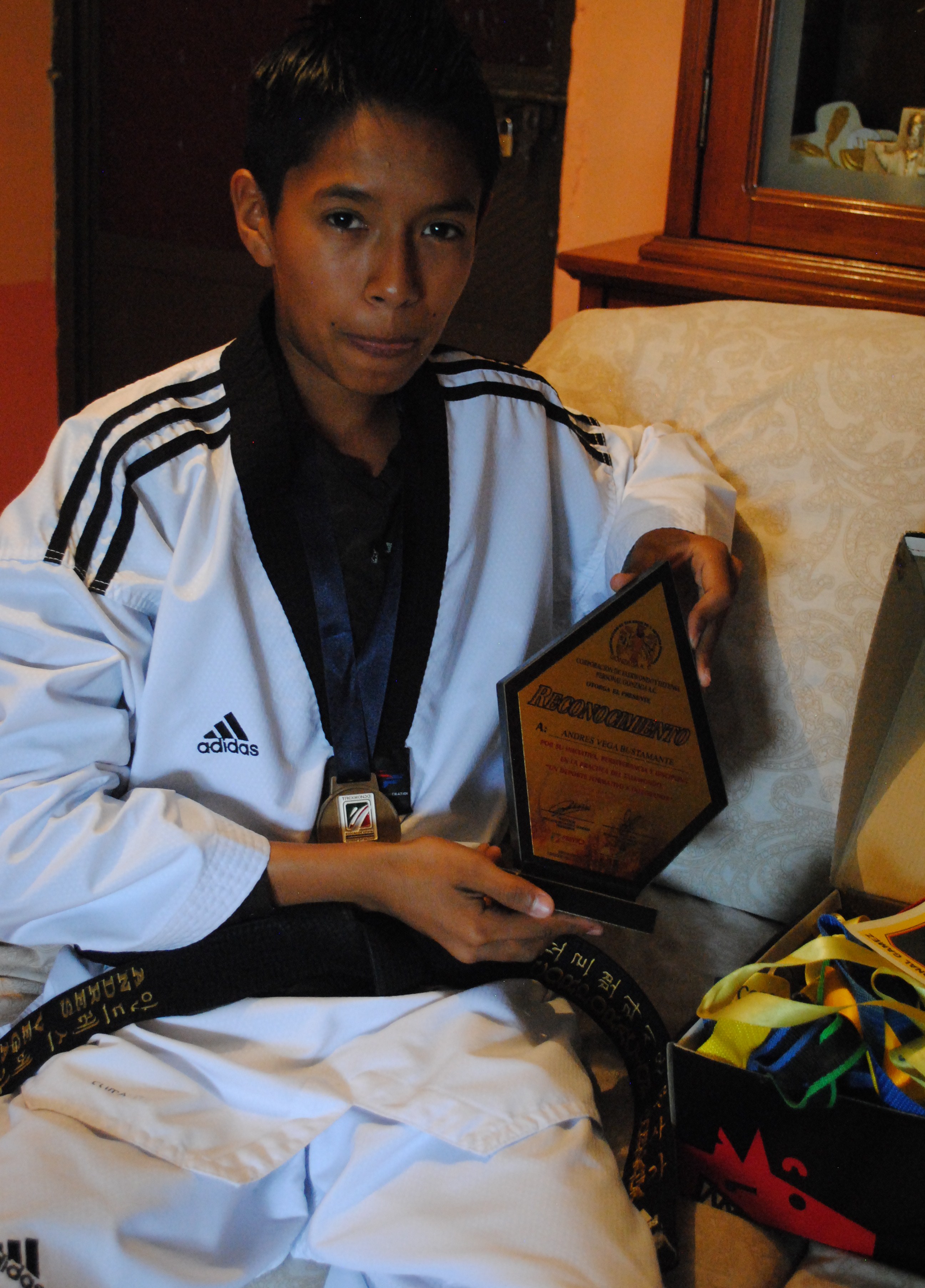 Andrés Vega que desde los seis años le llamó la atención practicar Tae Kwon Do, él recuerda, “cuando era niño me gustó el tae kwon do porque vi un desfile” y desde ahí asegura que el deporte es lo mejor.