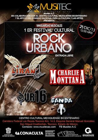 El Gobierno del Estado de México, CONACULTA, el Instituto Mexiquense de Cultura y el Centro Cultural Mexiquense Bicentenario y MUSITEC A.C., presentan el 1er. Festival Cultural de Rock Urbano, que se llevará a cabo en el CCMB el sábado 21 de diciembre.