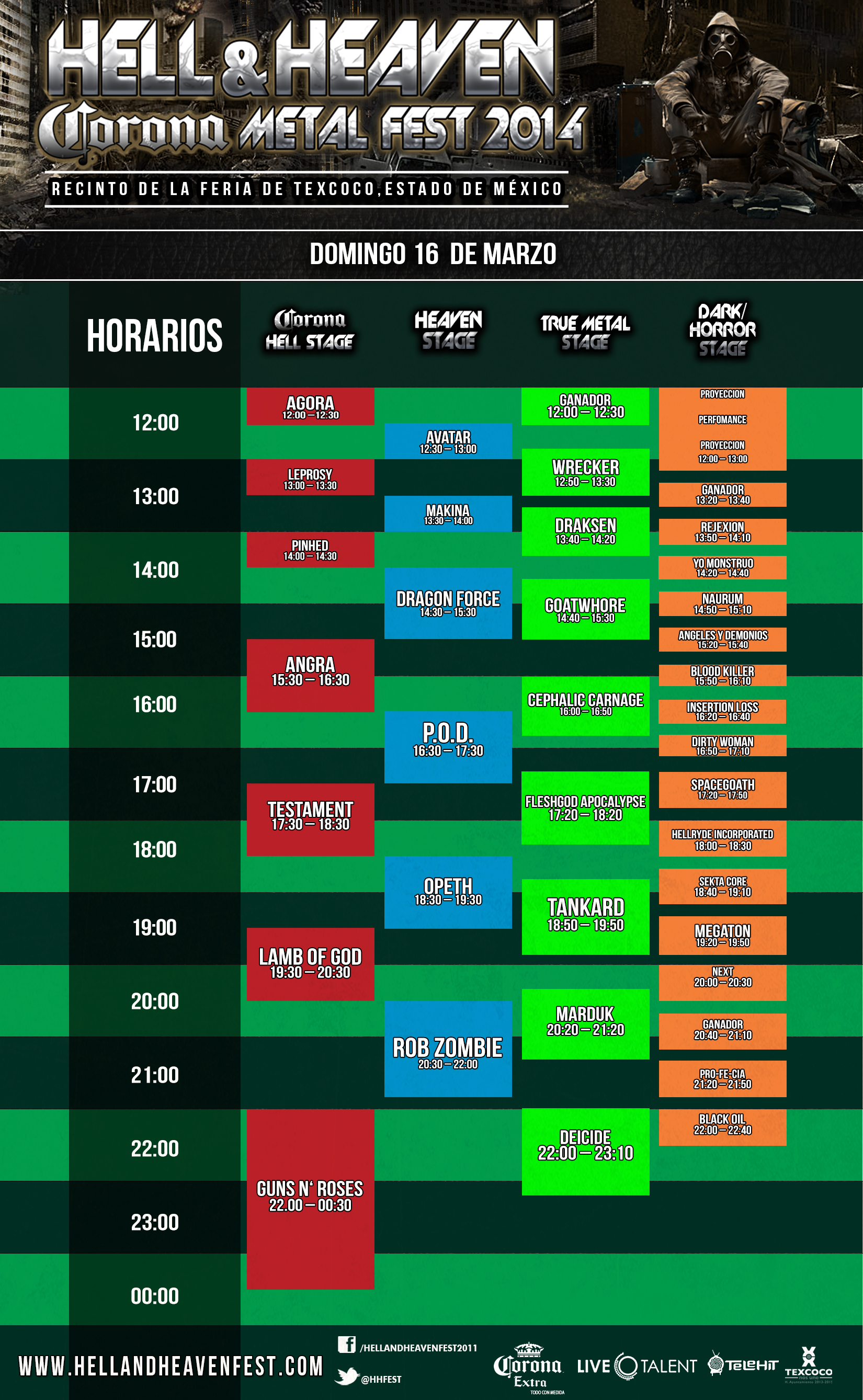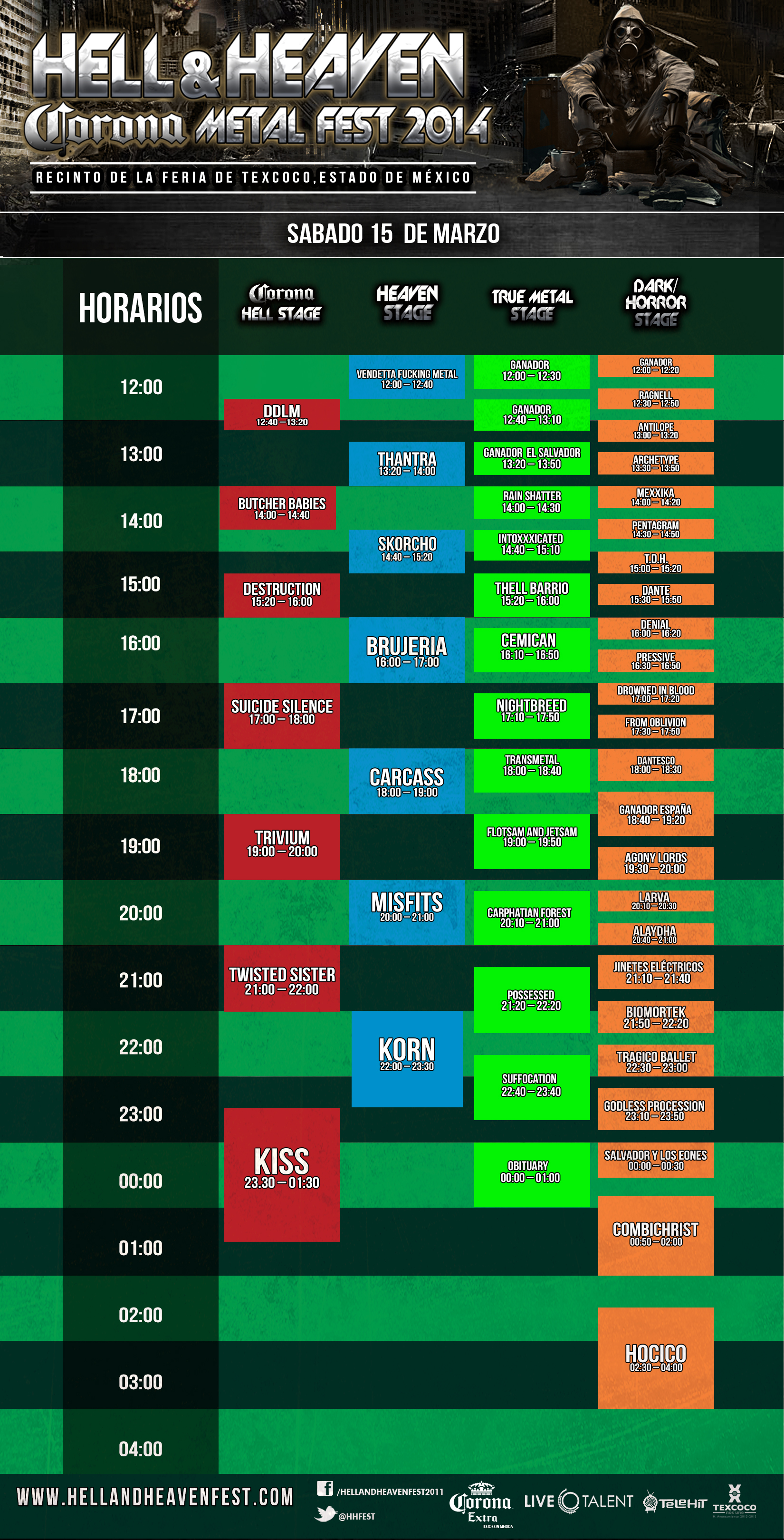 A través del área de prensa de Hell & Heaven Metal Fest 2014, dan a conocer los horarios que se mantendrán durante el recital musical los días sábado 15 y domingo 16 de marzo.