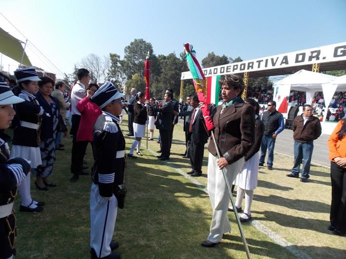 Al abanderar a 80 instituciones educativas y delegaciones municipales, la alcaldesa Delfina Gómez Álvarez exhortó a los alumnos durante su discurso, “Quiero decirles que poner en sus manos nuestra Bandera Nacional, ponemos también, la esperanza de todos nosotros, porque siempre la cuiden y la respeten, pero sobre todo que la honren con conductas decorosas, intachables y sanas”.