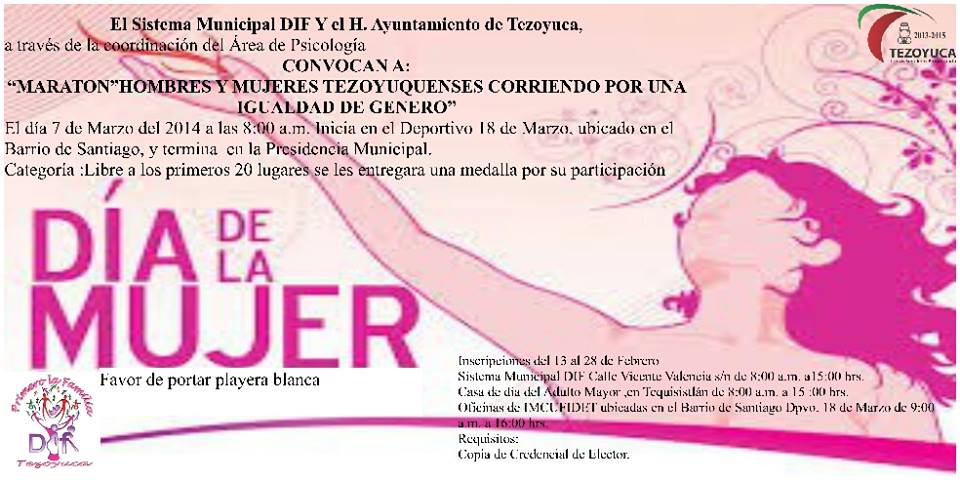 El Sistema Municipal DIF en coordinación con el Ayuntamiento de Tezoyuca, invitan a los habitantes de la región a participar en el “Maratón, hombres y mujeres tezoyuquenses, corriendo por una igualdad de género”, el próximo 7 de marzo a las 8 de la mañana, con motivo del Día Internacional de la Mujer.