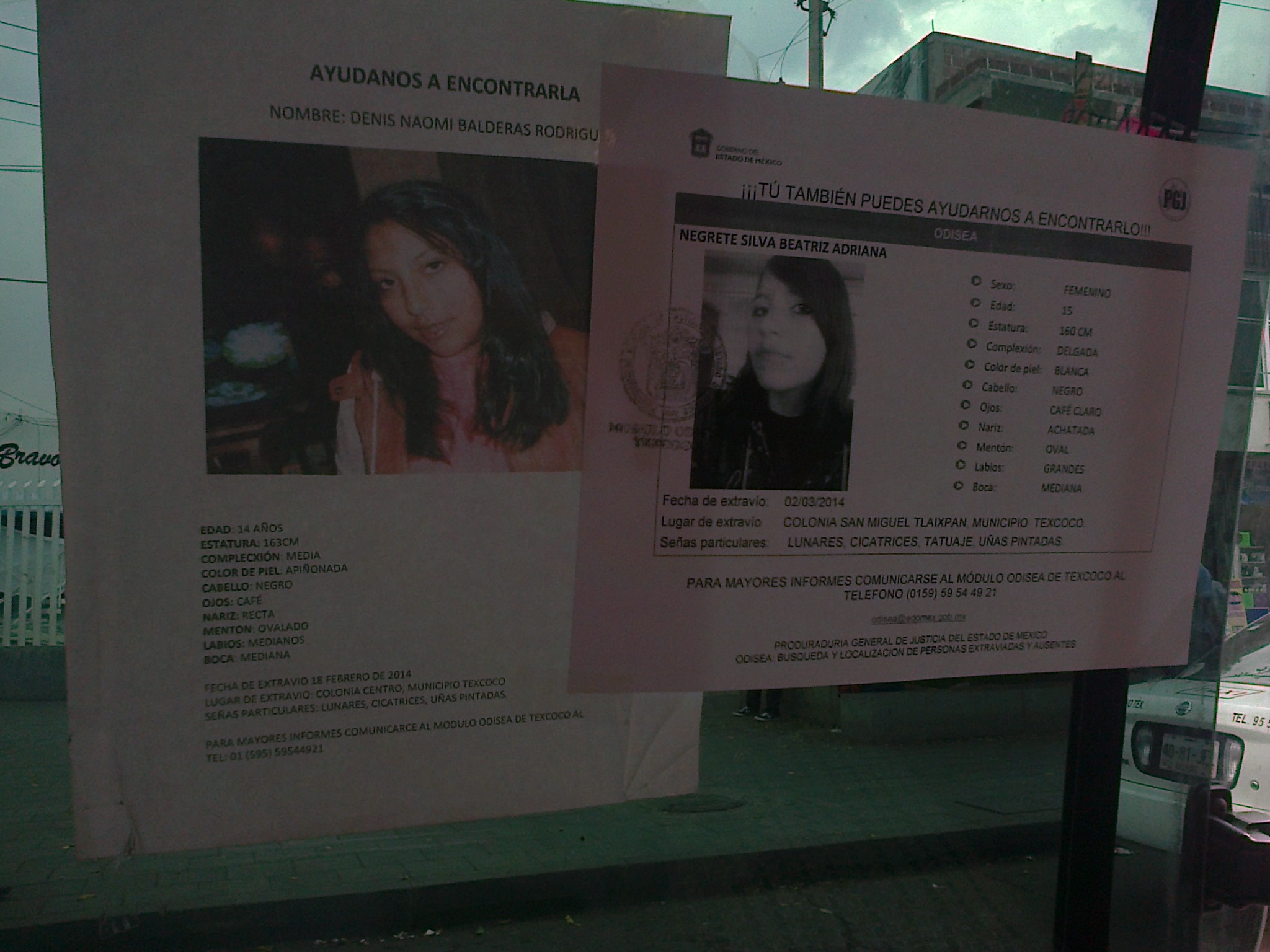Por medio de fichas técnicas pegadas en varios negocios y unidades del transporte público, familiares de dos jovencitas en el municipio de Texcoco esperan recibir datos sobre el paradero de sus hijas.