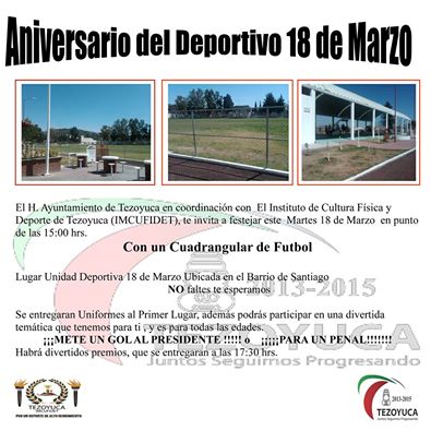 El ayuntamiento de Tezoyuca, en el estado de México en coordinación con el Instituto de Cultura Física y Deporte de Tezoyuca (IMCUFIDET), invitan a toda la comunidad a festejar este martes 18 en punto de las 15 horas al cuadrangular de futbol.