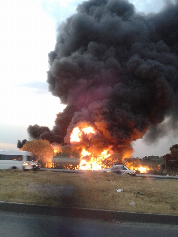 Bomberos de Texcoco apoyados de Atenco y Chicoloapan trabajan en el lugar del siniestro para evitar se siga propagando y con el respaldo de la policía estatal se acordona la zona para evitar choques entre automovilistas que circulan por esta vía.