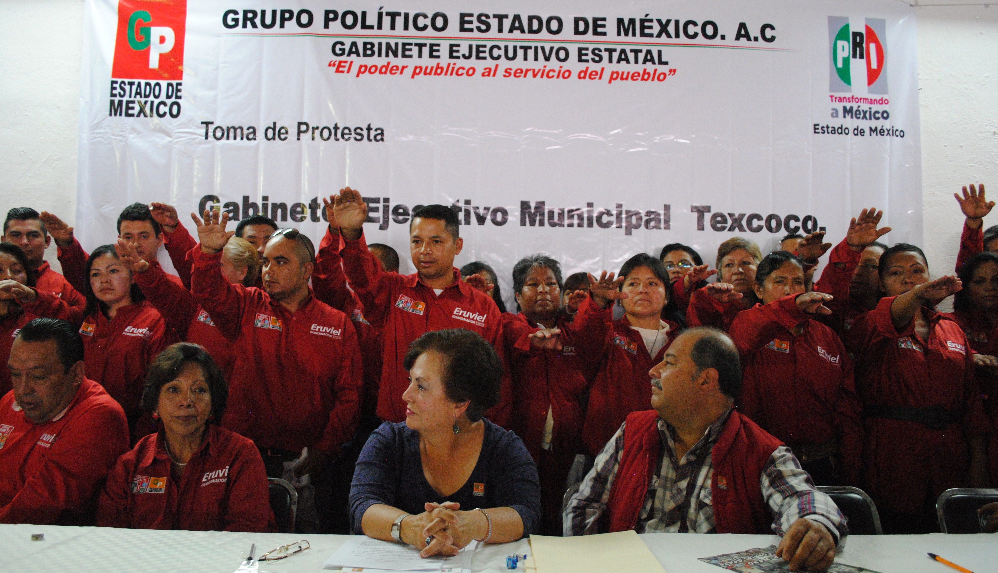Al rendir protesta el Grupo Político (GP), filial al Partido Revolucionario Institucional (PRI), en el municipio de Texcoco. Con un auditorio lleno de simpatizantes oriundos de la montaña, la comitiva se congregó para crear una nueva estructura partidista en la que aseguraron recuperar Texcoco para gobernar el próximo trienio.