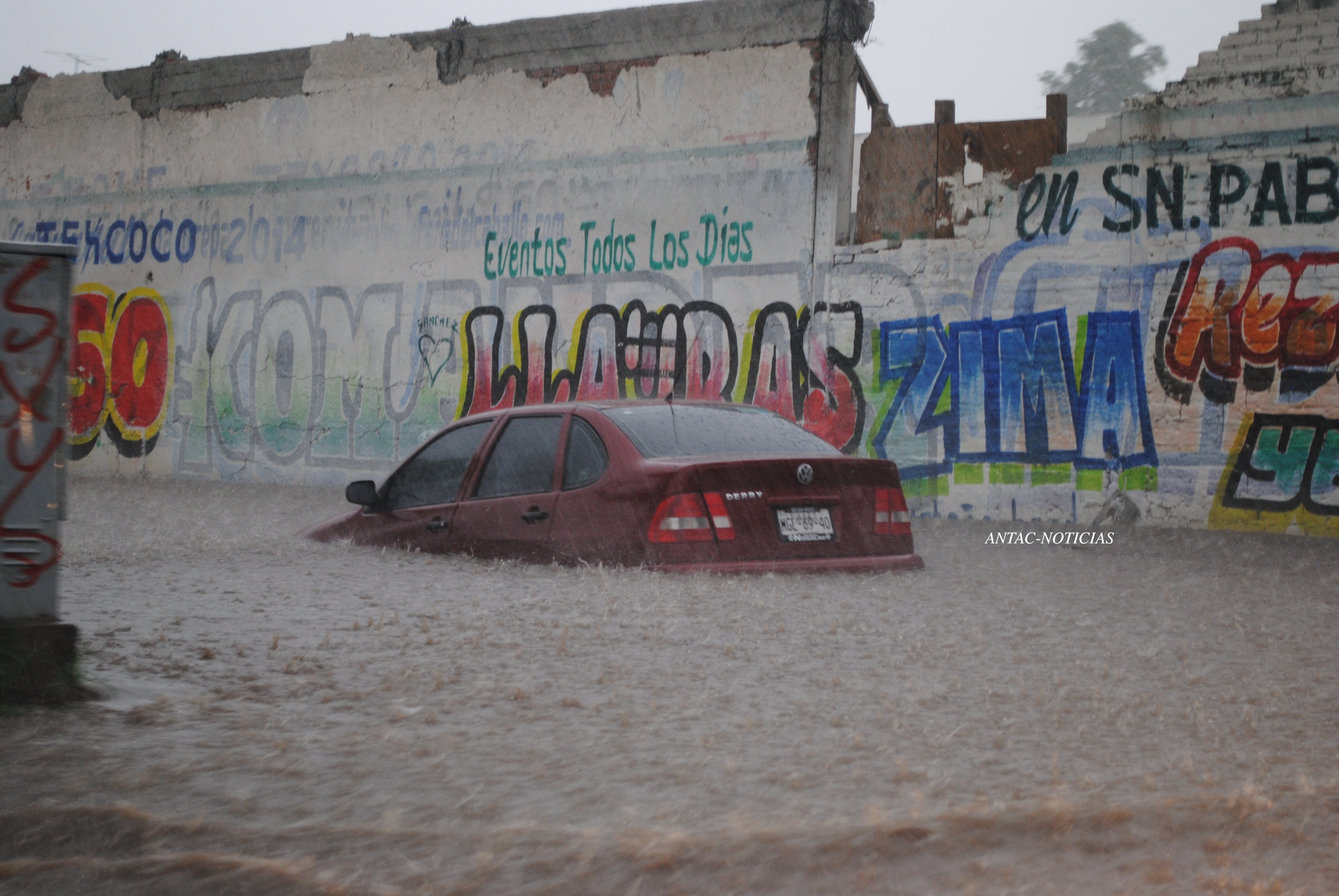 Esta tarde durante la precipitación pluvial al menos durante un recorrido por las principales calles del municipio de Texcoco, un automóvil quedó casi en su totalidad bajo el agua en la comunidad de Santa Cruz de Arriba.