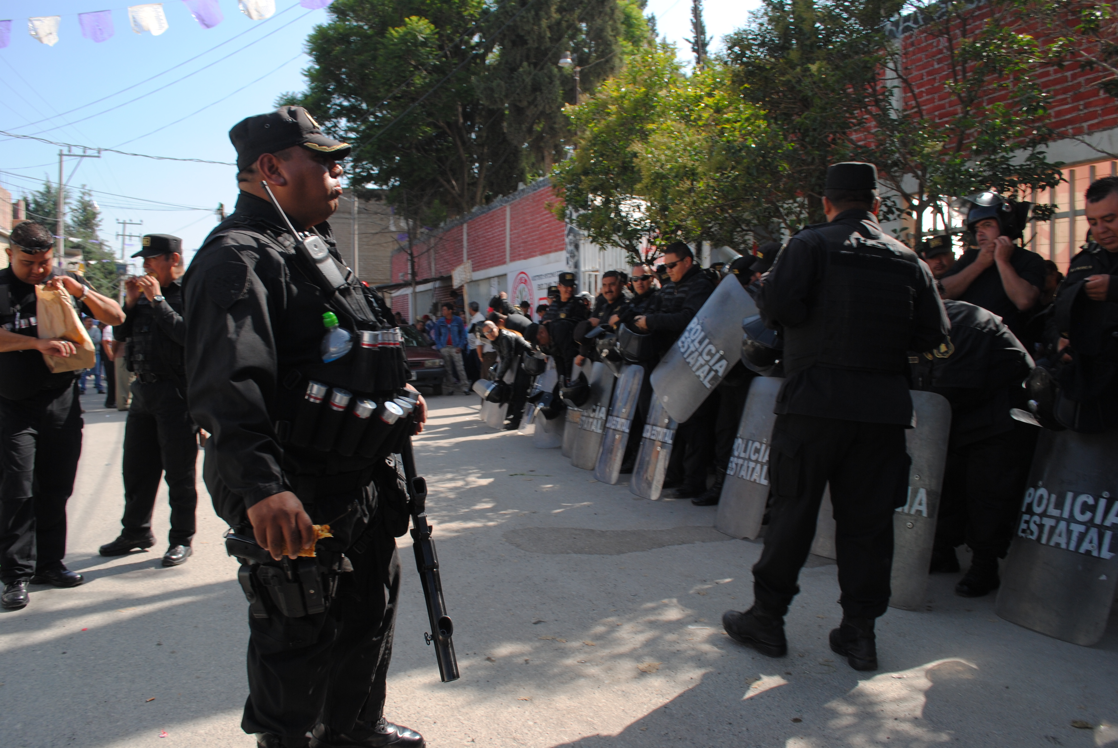 Al celebrarse una asamblea ejidal en el municipio de Chicoloapan, granaderos resguardan las oficinas ejidales junto con elementos de la policía municipal, ante un posible enfrentamiento entre ejidatarios de la zona por la presunta donación de 27 hectáreas en donde Andrés Aguirre Romero, presidente municipal de esta entidad, pretende construir dos centro educativos.