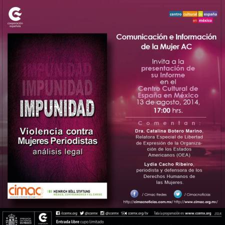 13 agosto, 2014 Antac Noticias CIMAC rendirá segundo informe de violencia contra mujeres periodistas en México