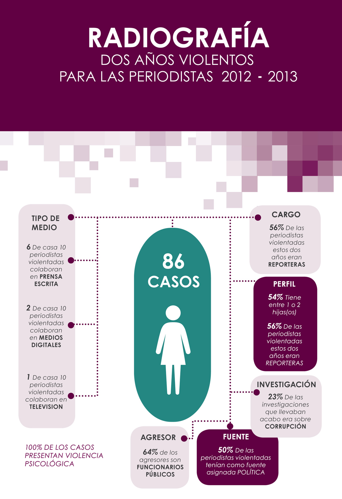 Entre 2012 y 2013 se presentaron 86 casos de violencia contra mujeres periodistas, de los que el 54 por ciento (47 casos) ocurrieron en 2013. Es el Distrito Federal donde ocurrieron 35 por ciento de los casos, lo que coloca a la entidad como la más peligrosa para las mujeres que ejercen el periodismo en el país, seguida de Veracruz.