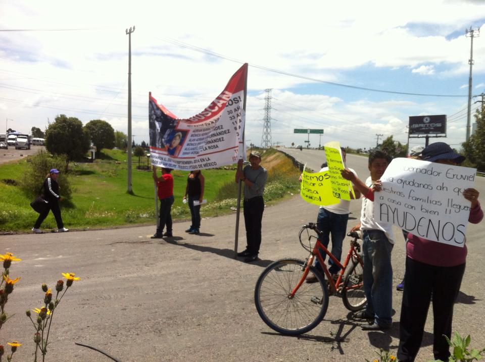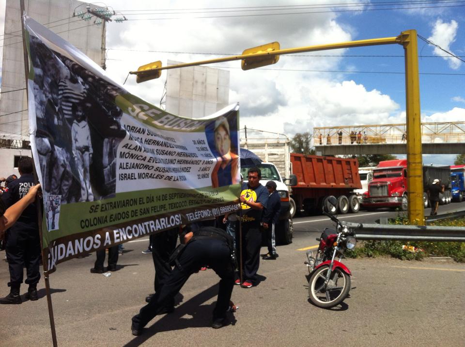 Durante esta tarde, familiares, amigos y vecinos de la familia desaparecida el pasado 14 de septiembre, bloquean la carretera federal Texcoco-Lechería a la altura de la comunidad de San Felipe, en el municipio de Texcoco.