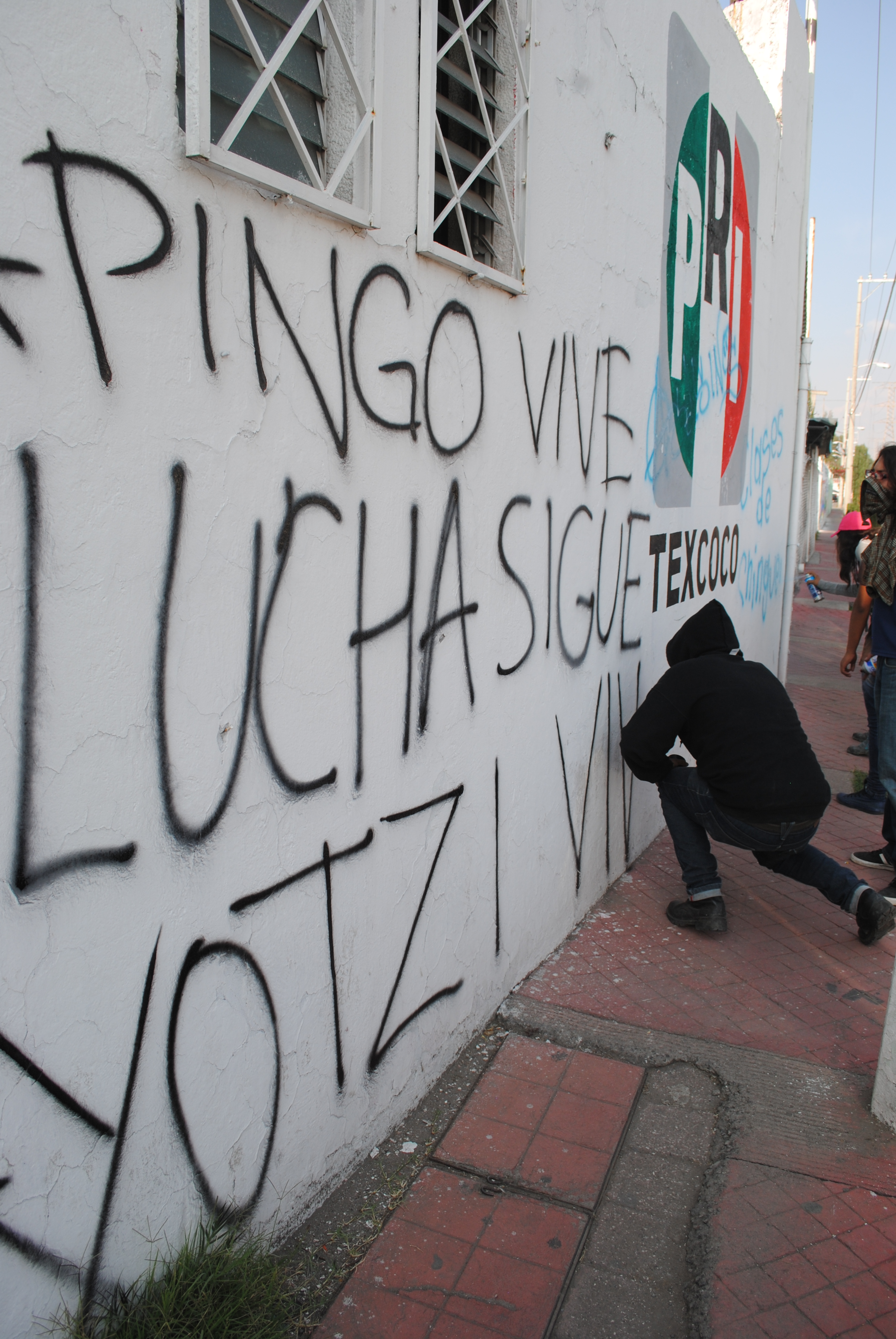 Al llegar frente a las instalaciones del comité municipal del PRI, colgaron mantas y pintaron leyendas en contra del gobierno federal como muestra de exigencia para resolver el caso de los 43 normalistas desaparecidos.