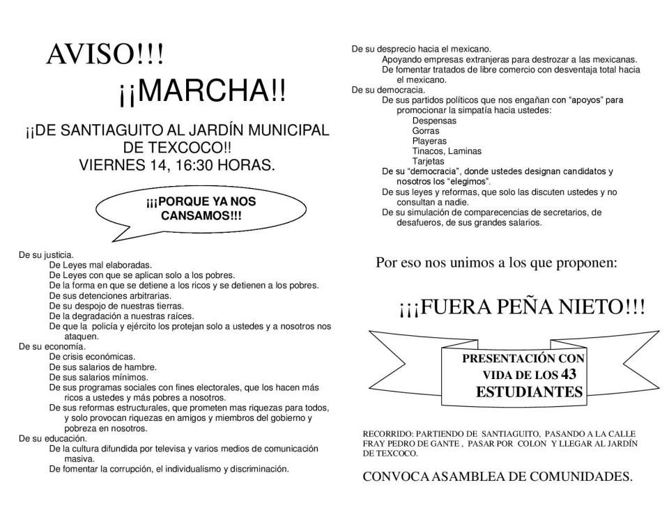 Habitantes de 10 comunidades de la zona de la montaña de los municipios de Texcoco y Tepetlaoxtoc, marcharán este viernes por la tarde para exigir al gobierno federal la «presentación con vida de los 43 estudiantes», marcha que partirá de la comunidad de Santiaguito para dirigirse hacia el jardín municipal de Texcoco.
