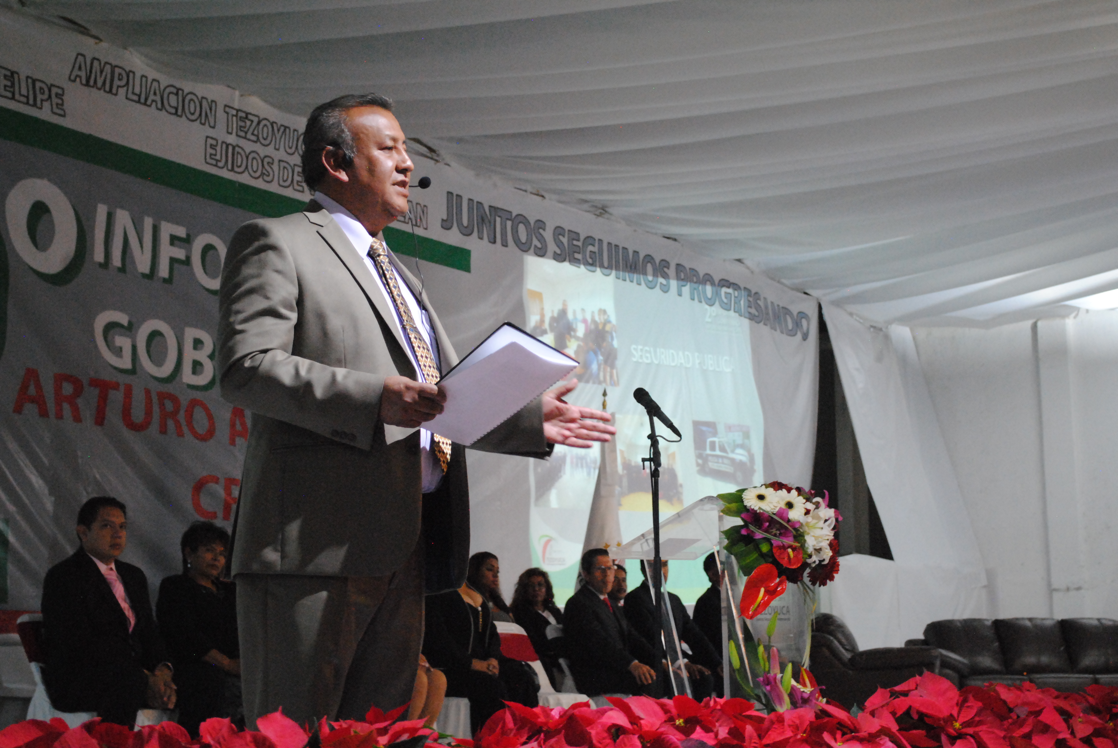 En un emotivo protocolo, aseguró el alcalde Ahumada Cruz que este 2014 “ha sido complicado, -empero- con el apoyo de mi Cabildo y Síndico, hemos logrado avances significativos cumpliendo compromisos”, con una inversión de 51 millones de pesos en obras. Destacando el apoyo en materia educativa en diferentes aspectos, apoyo a la vivienda, vialidad, alumbrado público, iglesias, apoyo a madres solteras adolescentes y jefas de familia, entre otros.