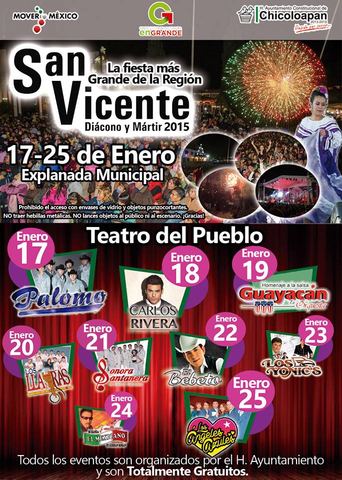 Por tercer año consecutivo se realiza la fiesta más grande de la región, “San Vicente Diácono y Mártir” en su edición 2015. La fiesta más esperada y emblemática del municipio está lista; familias completas acuden a la explanada municipal para disfrutar de la gran variedad de estilos musicales, teatrales y artísticos, además de la gastronomía, pirotécnia y juegos mecánicos que enmarcan nueve días de esta festividad.