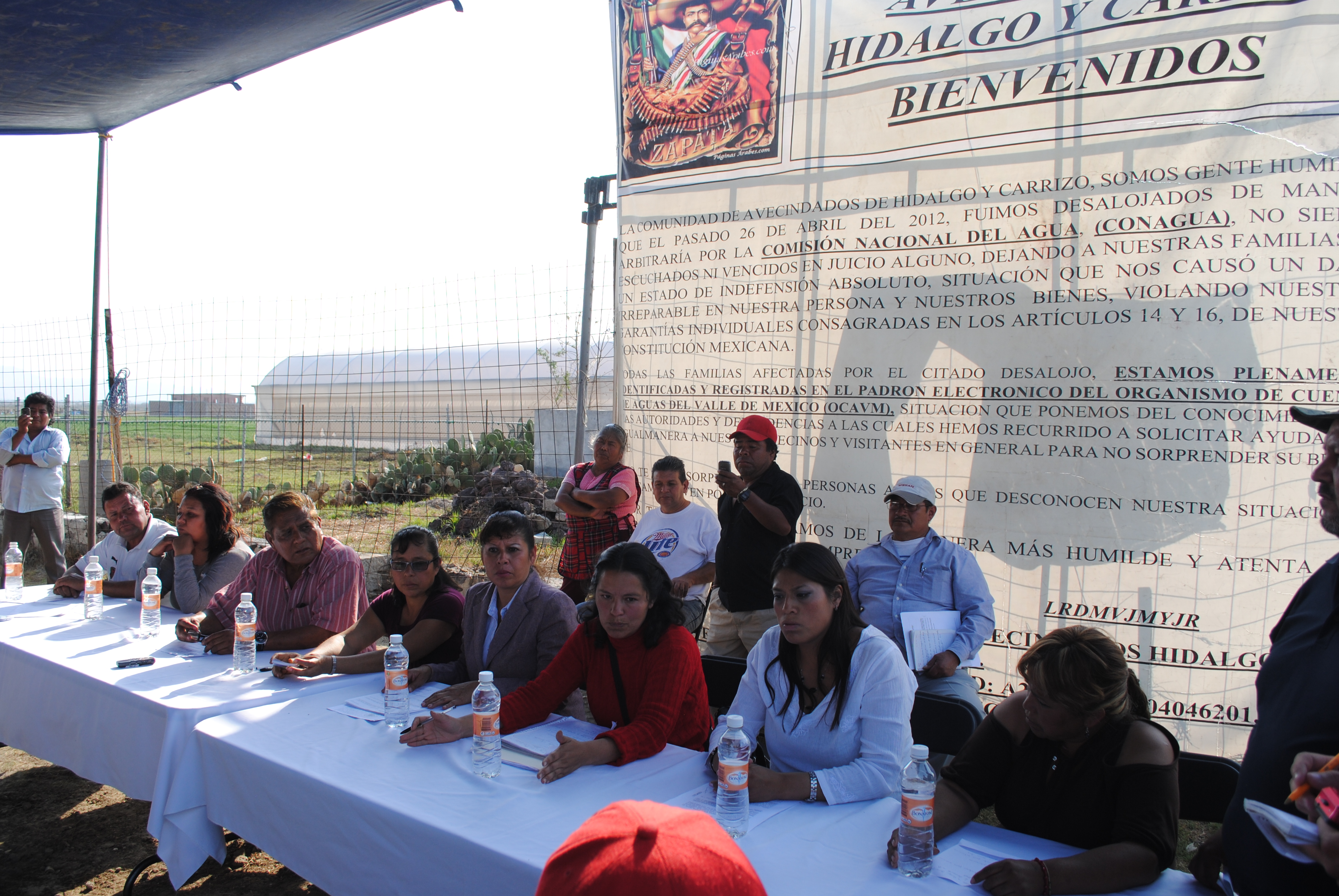 En una reunión celebrada por integrantes de la «Asociación Hidalgo y Carrizo», ubicados en un campamento en la comunidad de San Bernardino, en el municipio de Texcoco, denunciaron que desde el pasado 26 de abril del año 2012 fecha en que fueron desalojados por el Gobierno Federal, representado por la Comisión Nacional del Agua (CONAGUA), no han recibido ningún apoyo ni mucho menos recurso alguno para resarcir el daño cometido respecto al patrimonio de al menos mil 98 familias que compraron legalmente una fracción de terreno.