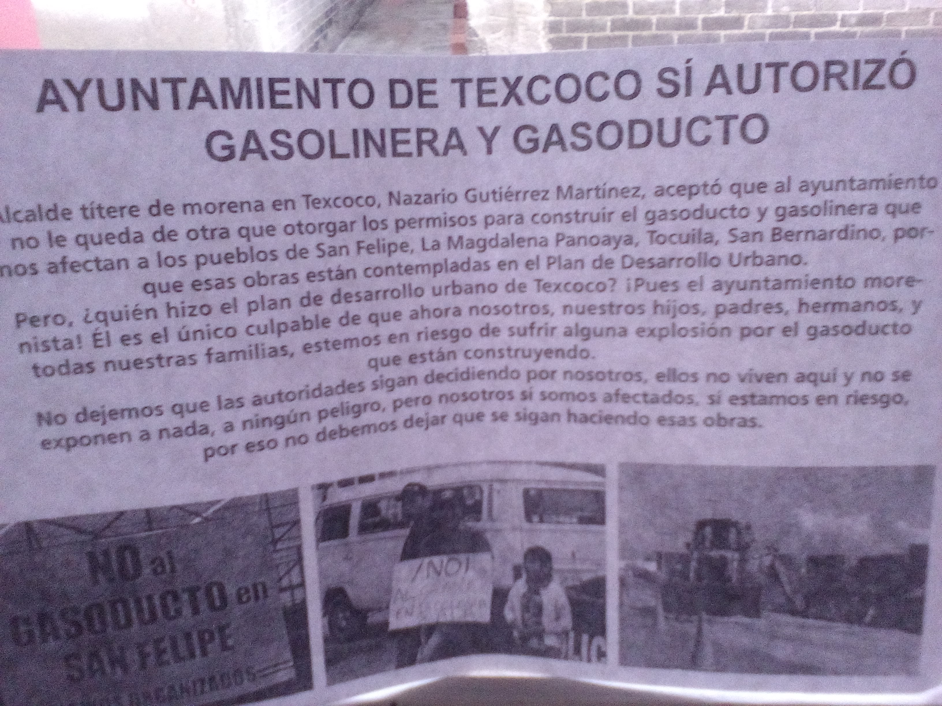 Durante la tarde de este jueves, habitantes de la comunidad de San Felipe, en el municipio de Texcoco, bloquearon la carretera federal Texcoco – Lecheria a la altura de la comercial mexicana para hacerle saber al gobierno municipal que no están de acuerdo con la construcción del gasoducto y una gasolinera, mismas que ponen en riesgo la seguridad de los colonos, aseguraron.