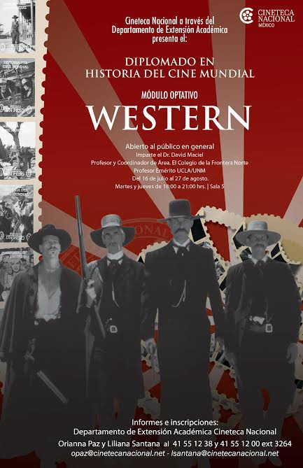 Con el fin de profundizar en este género, el Departamento de Extensión Académica de la Cineteca Nacional abre inscripciones al módulo El Western, que forma parte del diplomado Historia del Cine Mundial. Será impartido por David R. Maciel, Doctor Emérito en Historia por la Universidad de California, y tendrá lugar en la Sala 5, Matilde Landeta, del 16 de julio al 27 de agosto, los martes y jueves de 18:00 a 21:00 horas.
