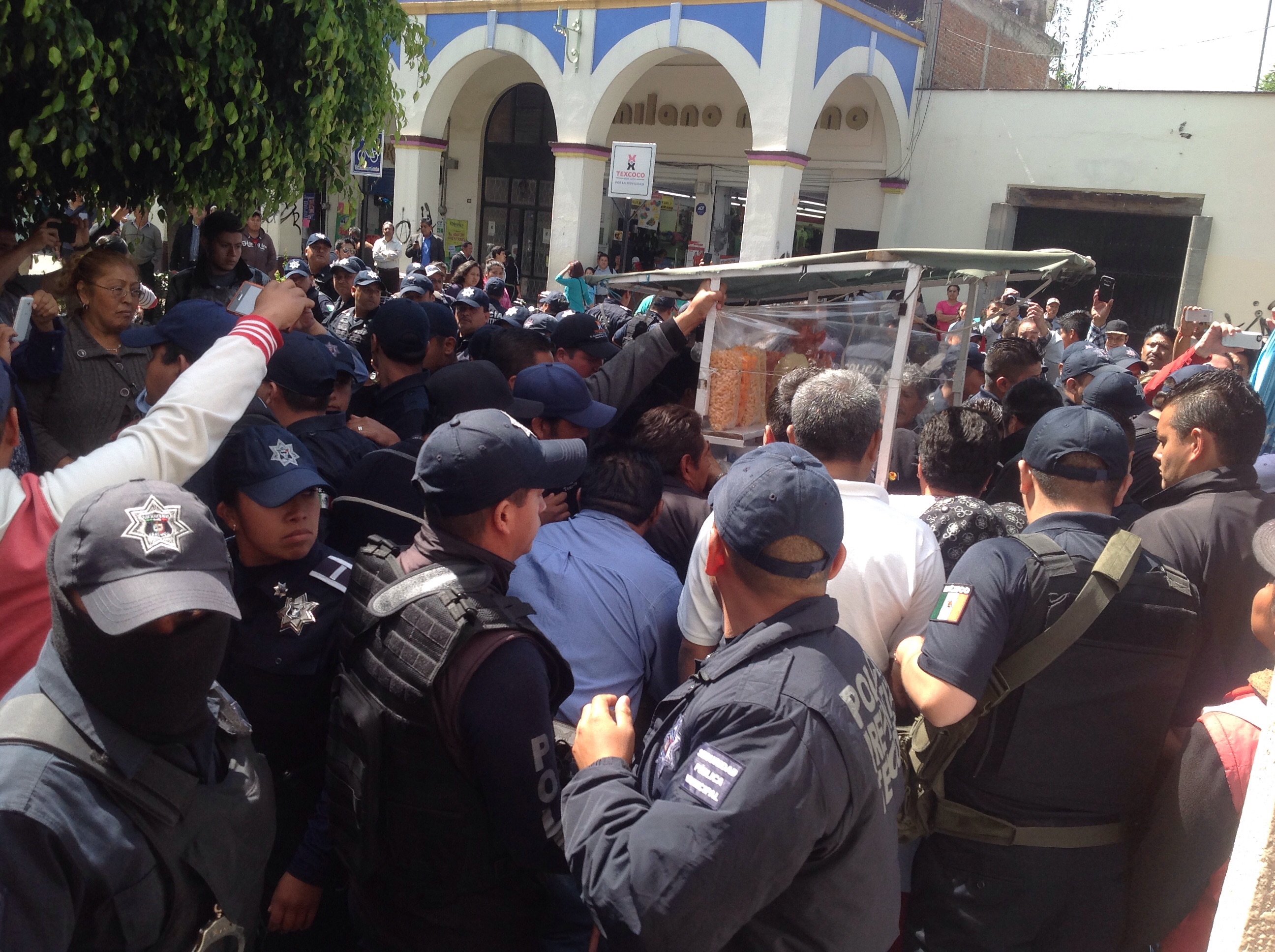 Alrededor de las once de la mañana un agrupamiento de policías, en un principio, diálogo con algunos líderes para hacer cumplir la ley, negándose estos a retirarse del lugar, instantes que en cuestión de minutos los uniformados formaron una fila para quitar uno de los puestos en donde la gente asesorada por antorchistas, empezaron a agredir a los uniformados.