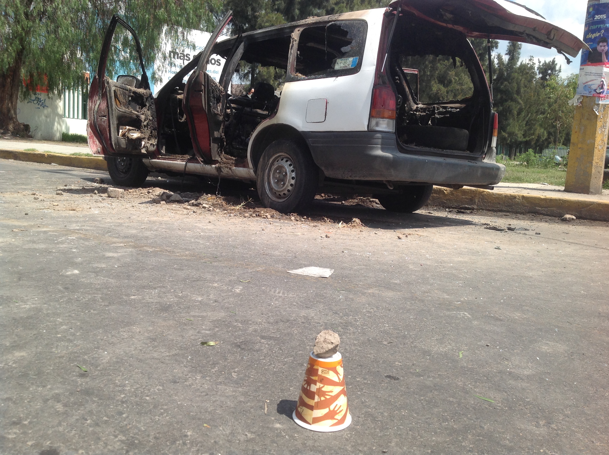 En un primer punto cerca del hospital «Gustavo Baz Prada» quedó una unidad incendiada con un impacto de arma de fuego a la altura del tanque de gasolina cuyo conductor viajaba con personas ofreciendo el servicio.
