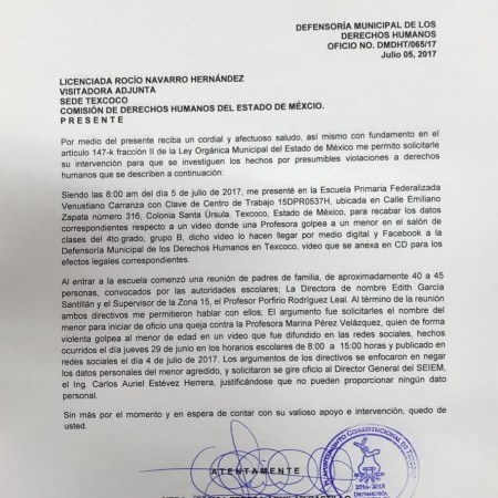 Defensora municipal inicia queja contra maestra agresora en Texcoco