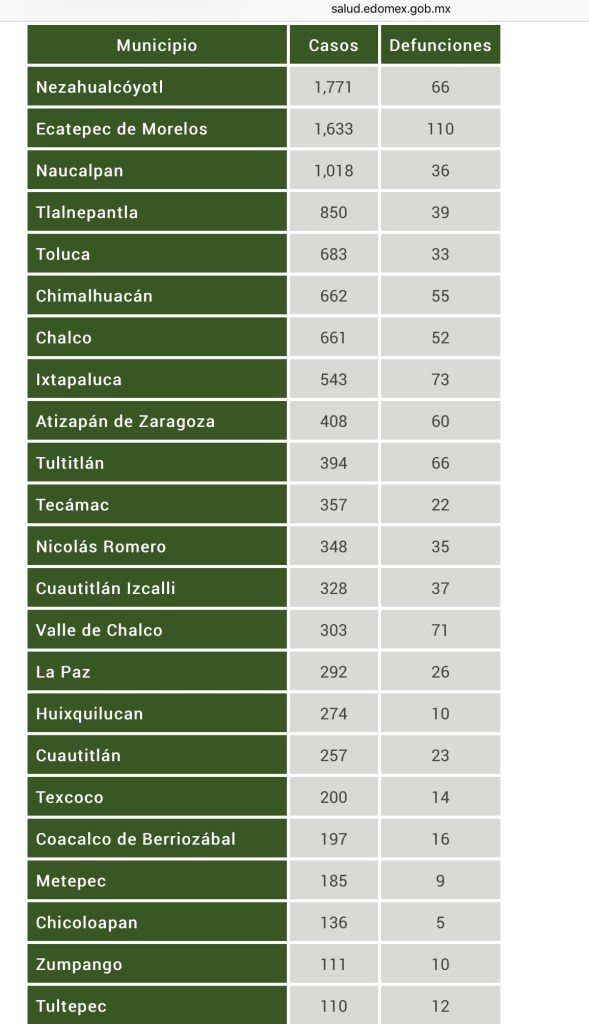 Texcoco, Edomex. Luego de que la Secretaría de Salud publicara los casos de contagios por Covid-19 a partir del 24 de abril, el municipio de Texcoco ocupaba el lugar 19 de entre los municipios mexiquenses. http://salud.edomex.gob.mx/salud/covid19_municipio