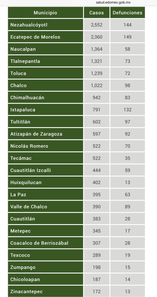 Texcoco, Edomex. Para el último corte la Secretaría de Salud del Estado de México ha registrado 20 mil 723 casos por Covid-19 http://salud.edomex.gob.mx/salud/covid19_municipio mil 31 casos en 24 horas y 1,761 defunciones.