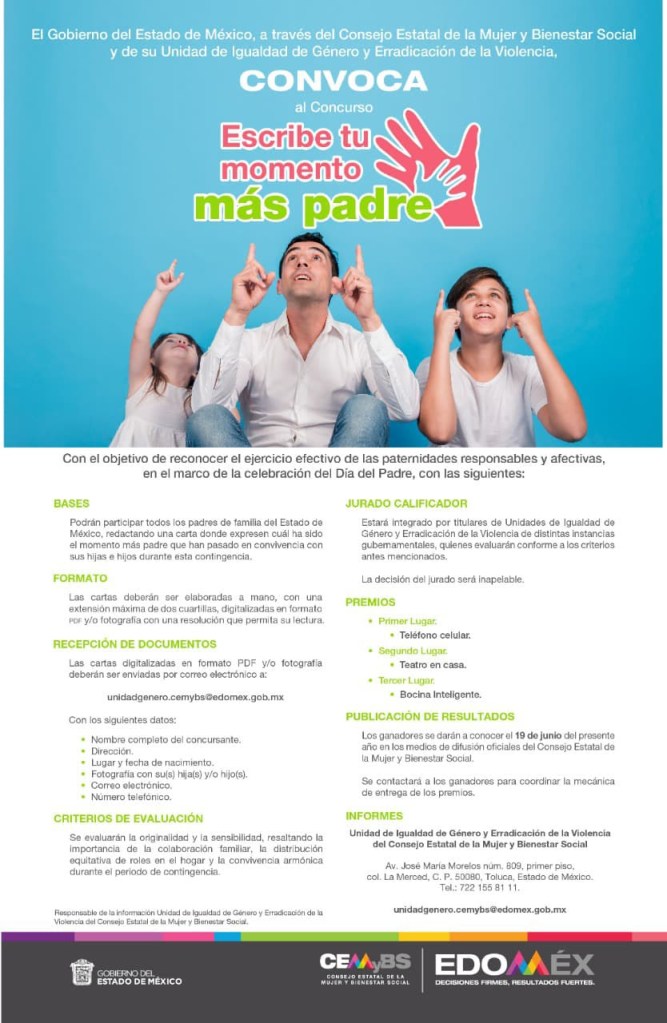 Podrán participar los papás mexiquenses redactando una carta en la que expresen cuál ha sido el momento más padre que han pasado en convivencia con sus hijas e hijos durante esta contingencia derivada del COVID-19.