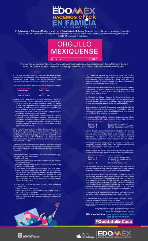 Ante la contingencia por COVID-19, esta convocatoria busca mostrar la riqueza, diversidad y patrimonio de la cultura mexiquense, a través de un video o fotografía en el que se pueden usar todas las disciplinas y vertientes artísticas, siempre y cuando sea original, y no haya participado en otros concursos.