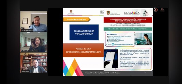 Al impartir la videoconferencia “La nueva normalidad y la Justicia Laboral”, que organizó el Colegio de Abogados del Valle de México (CAVDEM) Filial Cuautitlán, el Presidente de la Junta añadió que se intensificará el uso de las Tecnologías de la Información y la Comunicación para realizar video conciliaciones.