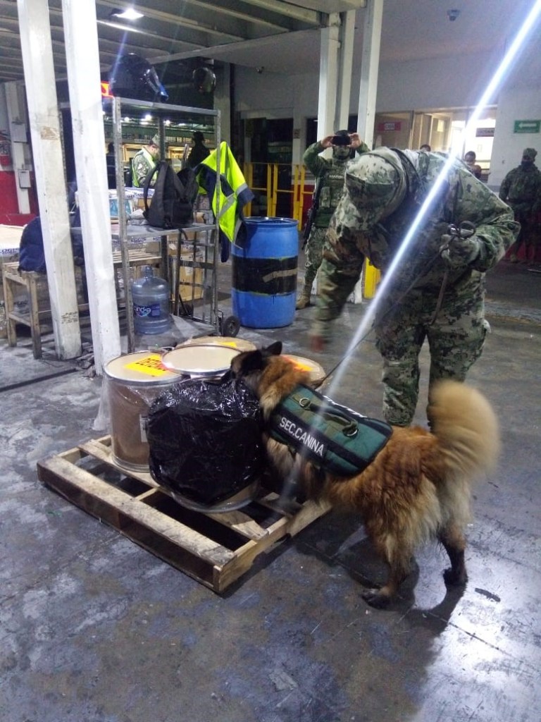 Realizaron la revisión con dos binomios caninos en el área de carga de un almacén y detectaron el material ilícito conocido como fentanilo.
