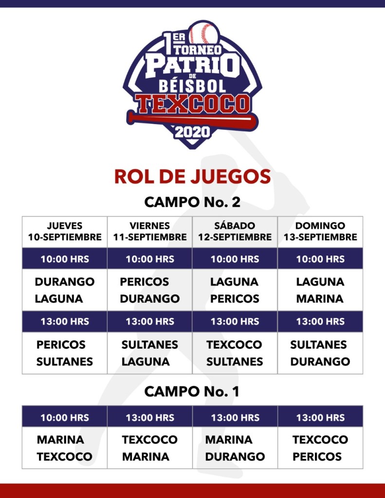 Texcoco, Edomex. Respetando las medidas sanitarias de distanciamiento social y a puerta cerrada, se realizará en Texcoco el 1er Torneo Patrio de Béisbol Texcoco 2020, del jueves 10 al domingo 13 de septiembre, con la participación de los equipos: Sultanes de Monterrey, Generales de Durango, Unión Laguna y Pericos de Puebla, equipos integrantes de la Liga Mexicana de Béisbol, y los equipos integrantes de la Secretaría de Marina y de Texcoco, con transmisión a través de las redes oficiales del Gobierno de Texcoco.
