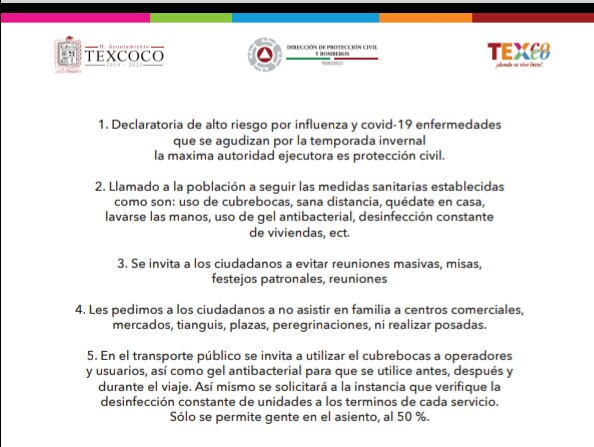 Ante esta temporada de fin de año, explicó que todos los habitantes del municipio de Texcoco y municipios vecinos deben de tomar en cuenta las medidas sanitarias y reforzar todas aquellas acciones para evitar posibles contagios.