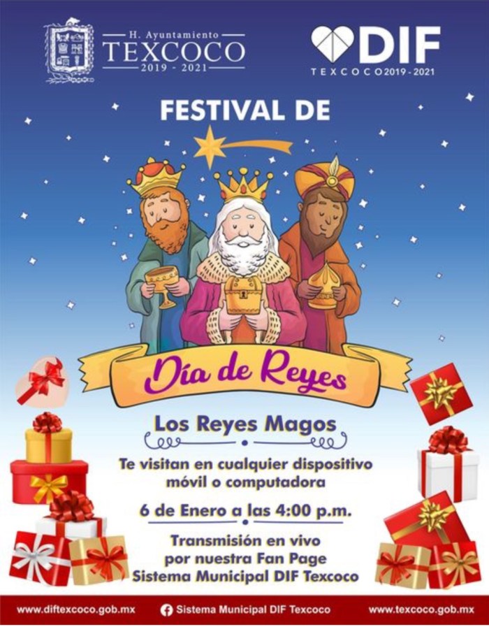 La Directora del DIF Texcoco Magdalena Moreno Vega, informó que el festival de Día de Reyes, tendrá lugar este 6 de enero a partir de las 16:00 horas, y podrán seguirlo a través de la cuenta de facebook Sistema Municipal DIF Texcoco y las páginas web http://www.diftexcoco.gob.mx y wwwtexcoco.gob.mx.