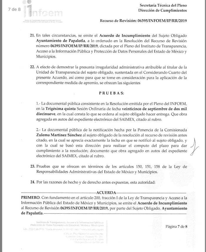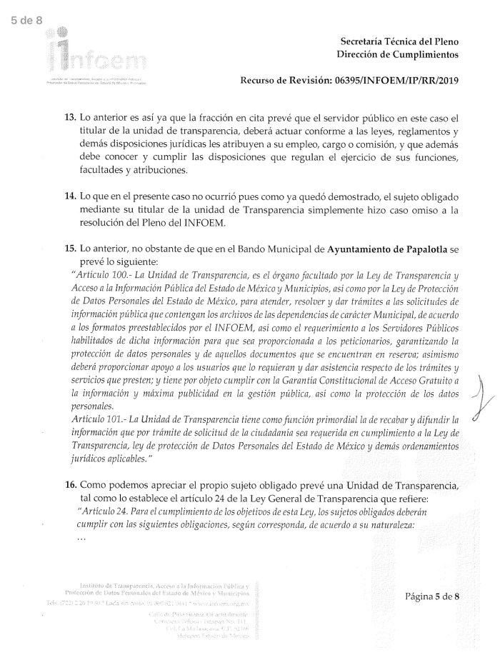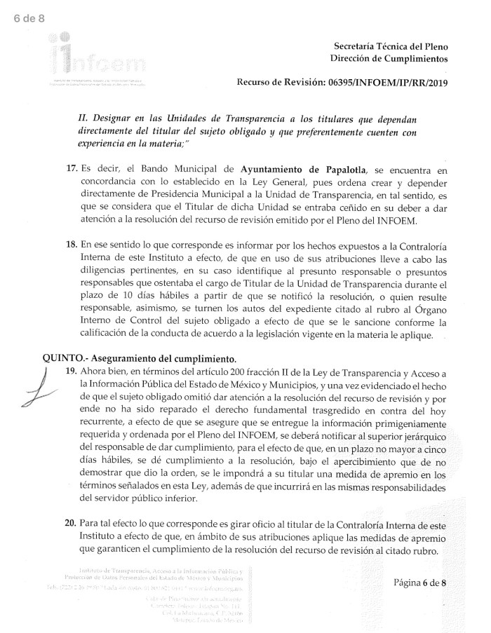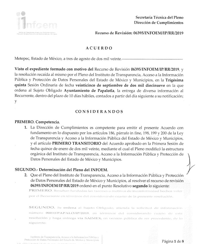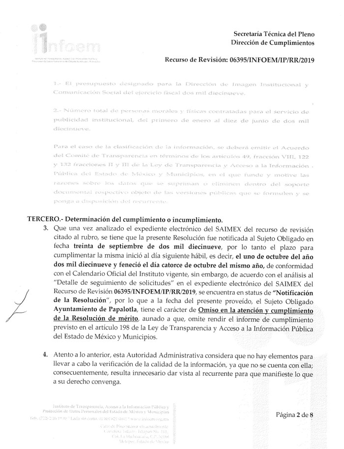 Con esta solicitud las prórrogas fueron solicitadas por personal del ayuntamiento de Papalotla, sin embargo la información nunca fue entregada hasta llegar al Recurso de Revisión con folio 06395/INFOEM/IP/RR/2019, de lo cual el Pleno del Instituto de Transparencia, Acceso a la Información Pública y Protección de Datos Personales del Estado de México y Municipios a través de la Dirección de Cumplimientos, Secretaría Técnica del Pleno del Infoem notificó al ayuntamiento para proceder conforme a derecho por la presunta irregularidad administrativa.