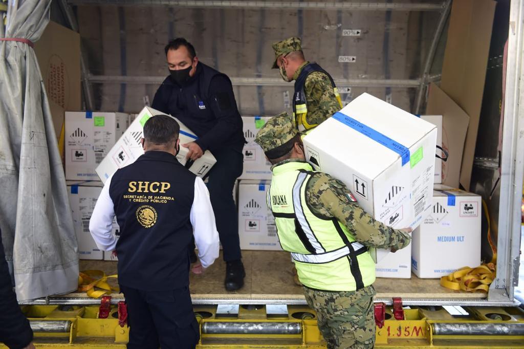 Recibieron el lote de vacunas el Administrador General de Aduanas, Horacio Duarte Olivares, el Secretario de Salud, Jorge Alcocer, el Secreterio de Relaciones Exteriores, Marcelo Ebrard y el Secretario de Hacienda, Arturo Herrera.