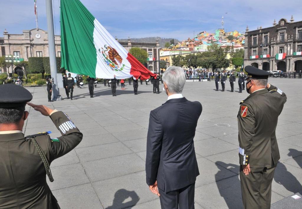 El izamiento de bandera, a cargo de elementos de la Secretaría de Seguridad, fue atestiguado también por Anais Burgos Hernández, Presidenta de la Mesa Directiva de la LX Legislatura estatal; Ricardo Sodi Cuéllar, Presidente del Tribunal Superior de Justicia; Maurilio Hernández González, Presidente de la Junta de Coordinación Política de la LX Legislatura; Francisco Jesús Leana Ojeda, Comandante de la 22a Zona Militar.