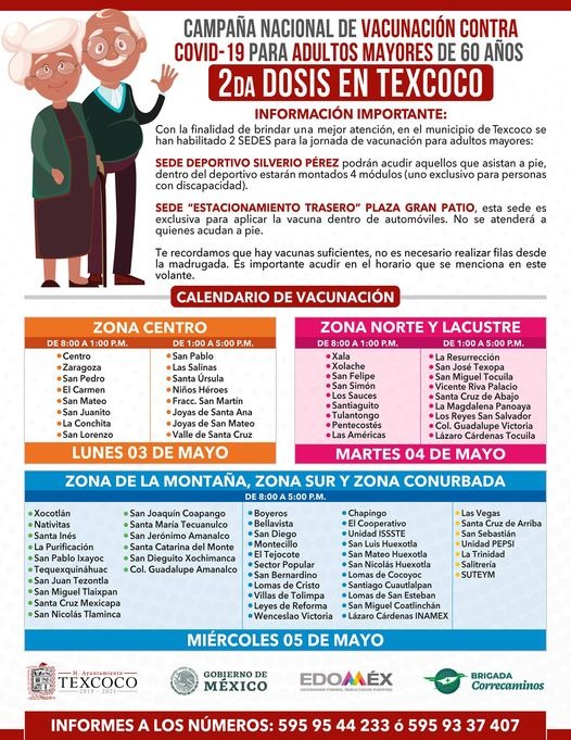 Texcoco, Edomex. El gobierno municipal de Texcoco, en coordinación con las brigadas correcaminos del gobierno federal y el gobierno del Estado de México, aplicará del lunes 3 al miércoles 5 de mayo, la segunda dosis de vacuna contra el Covid-19, para adultos mayores de 60 años.