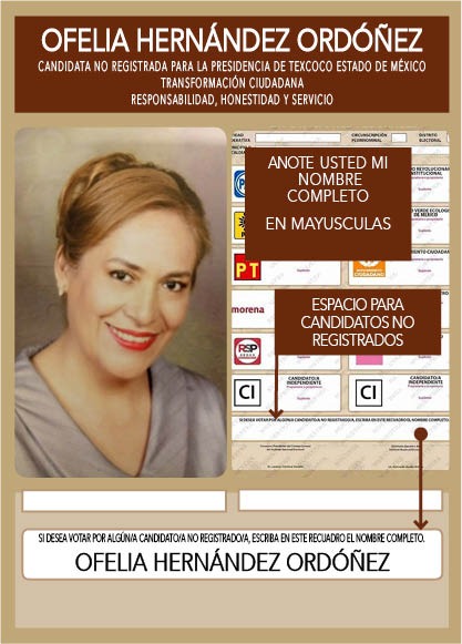 Texcoco, Edomex. Ofelia Hernández Ordóñez, candidata no registrada a la Presidencia Municipal de Texcoco hace un llamado a todos los texcocanos para que en estas próximas elecciones realicen un voto útil y escriban su nombre en el recuadro de la boleta este próximo seis de junio.