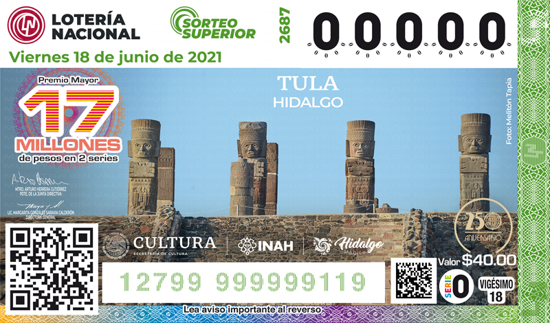 CDMX. La Lotería Nacional presentó el billete del Sorteo Superior No. 2687, alusivo a la Zona Arqueológica de Tula, Hidalgo, en un evento que reunió a autoridades de este organismo, de la Secretaría de Cultura del Gobierno de México, a través del Instituto Nacional de Antropología e Historia (INAH), de la Coordinación de Memoria Histórica y Cultural de México y de la Asociación de Secretarios de Turismo de México (Asetur), así como del Gobierno del Estado de Hidalgo.