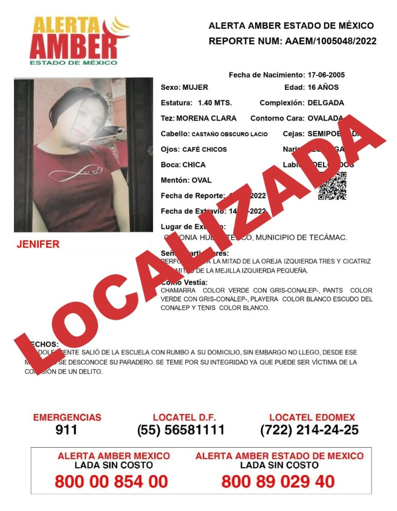 Tras la intervención de autoridades de ambas demarcaciones, la menor fue localizada con vida en el poblado, por lo que se procedió a reintegrarla con su familia, brindándoles la atención a los familiares para realizar la denuncia correspondiente. En tanto que la Alerta Amber quedó cancelada luego de ser localizada.