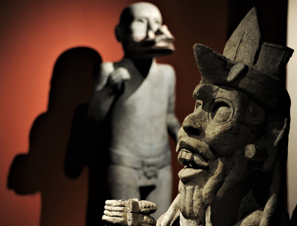Del complejo mundo mesoamericano se pueden observar lo mismo estelas, urnas y máscaras funerarias de antiguas ciudades mayas como La Mar, en Chiapas, y Calakmul, en Campeche, que impactantes esculturas de piedra como la “Señora de la falda de estrellas”, del sitio popoloca Tehuacán Viejo, en Puebla, “El Creador”, procedente de Xochicalco, Morelos, o la deidad mexica del viento, “Ehécatl”. Ello, sin contar refinadas y frágiles piezas como el “Cuexyo chimalli” de Moctezuma II, un escudo de piel de ocelote fechado en 1519.