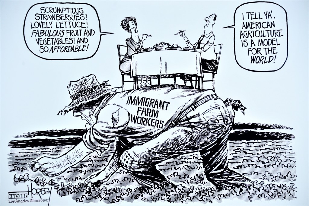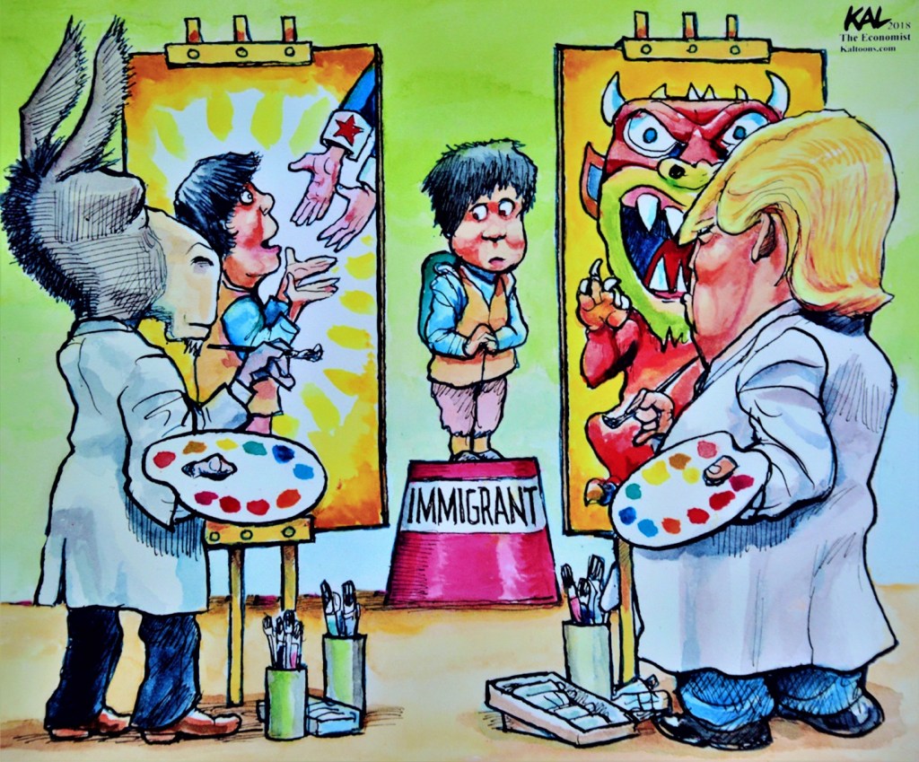 Caricaturistas y moneros fueron invitados a ejercer esta crítica profunda, desde la indignación, la ironía y la lucidez. Se trata de artistas conocidos por su colaboración en medios: el suizo Patrick Chappatte, los mexicanos Ángel Boligán, Chavo del Toro, Cintia Bolio, Darío Castillejos y Rapé; y los estadounidenses Ann Telnaes, Kevin Kallaugher, Clay Bennett, David Horsey, Jeff Danziger, Matt Wuerker, Nick Anderson y Rob Rogers.