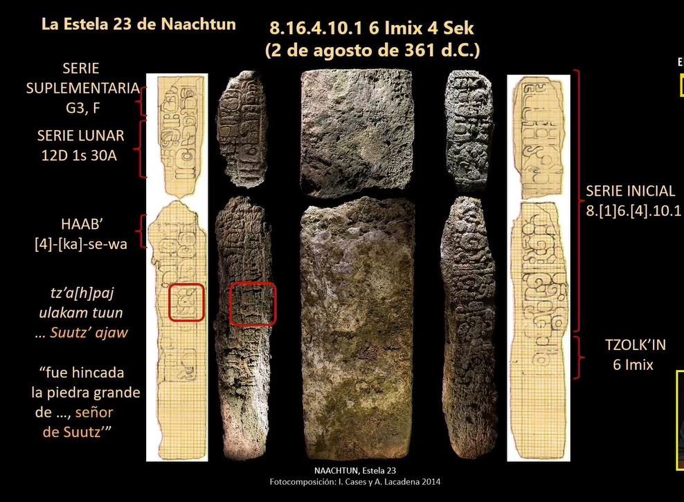 No obstante, Philippe Nondédéo explicó que otros datos que permiten reconstruir lo ocurrido en el año 378 pueden extraerse al confrontar la Estela 24 con la Estela 23, una de las más tempranas de Naachtun.