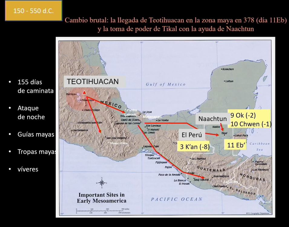 * Estelas del sitio arqueológico de Naachtun, en Guatemala, refieren que la toma de Tikal ocurrió el 16 de enero de 378 d.C.