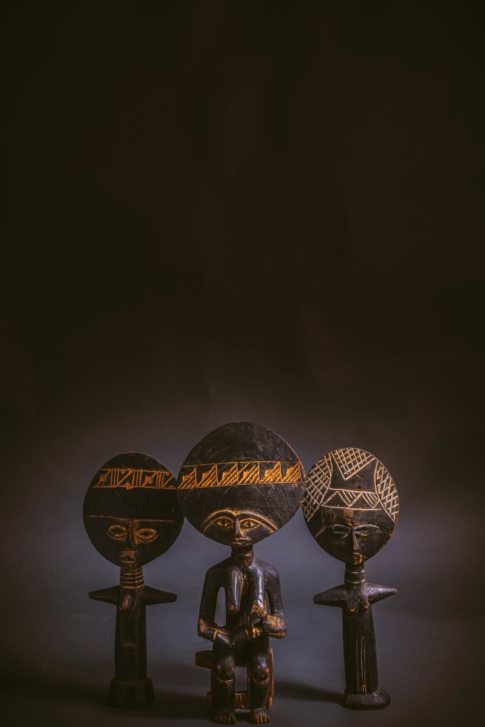 Entre las figuras talladas está un conjunto de muñecas rituales de fertilidad, conocidas como “akua´ba”, de la etnia ashanti; algunos dioses y fetiches en madera, y barro con aplicaciones de plumas y chaquiras, entre otras.