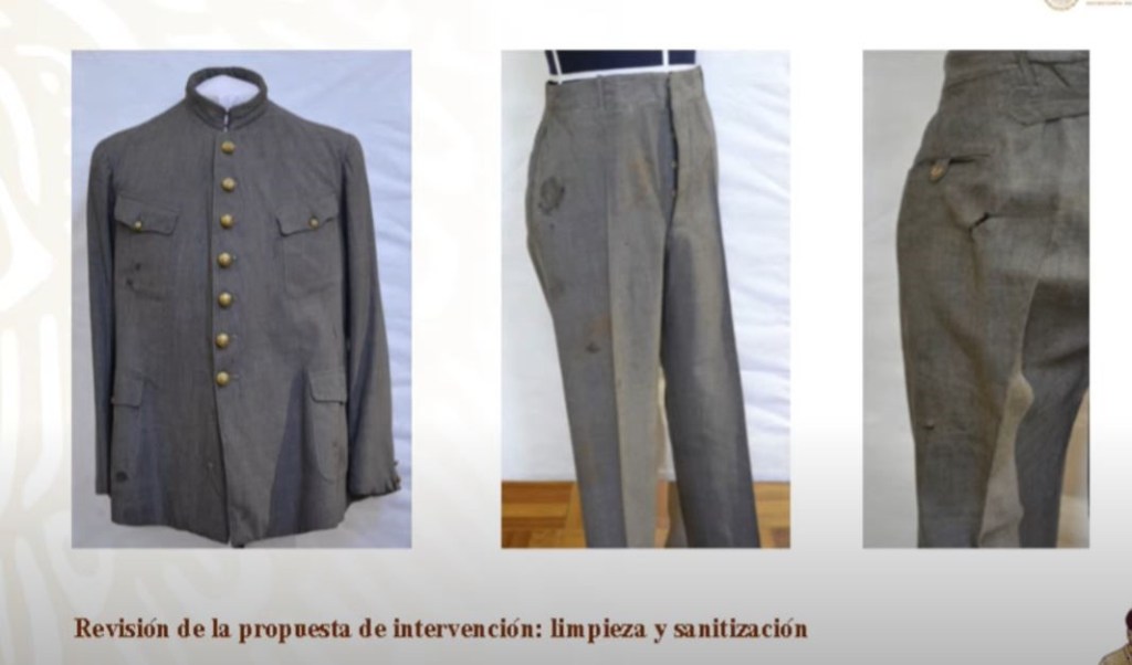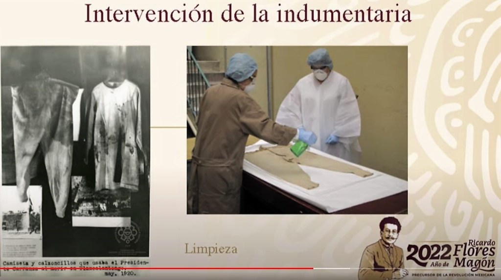 “Esto sin duda propició la conservación de los materiales, así como de sus indicios forenses”, indicó al hablar de la meticulosidad requerida para emprender los trabajos de limpieza y consolidación de las ropas, sin que estos alteren la evidencia de su homicidio, ocurrido el 21 de mayo de 1920 en la serranía de Tlaxcalantongo, Puebla.