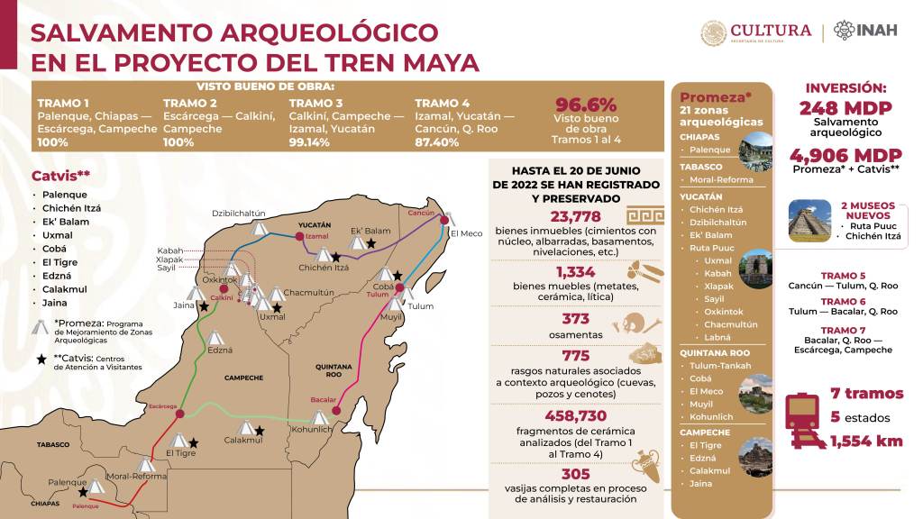 En el encuentro con los medios de comunicación, en Palacio Nacional, se informó que la inversión del proyecto Tren Maya en materia de salvamento arqueológico asciende a 248 millones de pesos, a los cuales se suman 4,906 millones para el Promeza y la creación de los Centros de Atención a Visitantes (Catvis), lo que representa, en palabras del titular del INAH, “una oportunidad histórica para la puesta en valor del patrimonio cultural de la región”.