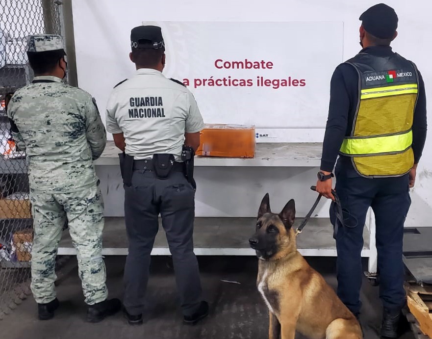 Al realizar revisiones preventivas en el recinto fiscalizador de carga aérea, del aeropuerto internacional de Tijuana, Baja California, guardias nacionales y verificadores, con el apoyo de un binomio canino localizaron una caja, en la que dieron señal positiva ante la posible presencia de algún material u objeto ilícito.