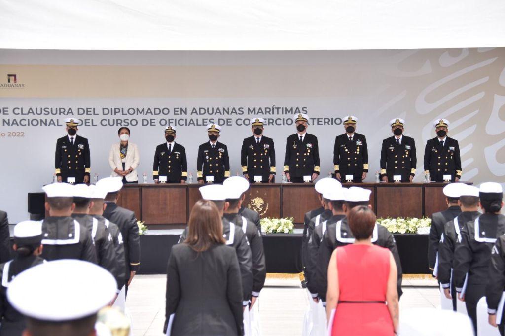 CDMX. Esta tarde se llevó a cabo la Ceremonia de Clausura del Diplomado de Aduanas Marítimas y Seguridad Nacional, así como del Curso de Oficiales de Comercio Exterior, en el Centro de Estudios Navales en Ciencias de la Salud, donde 110 elementos terminaron esta etapa en la que fortalecieron sus conocimientos para mejorar su desempeño en el Sistema Aduanero Mexicano.